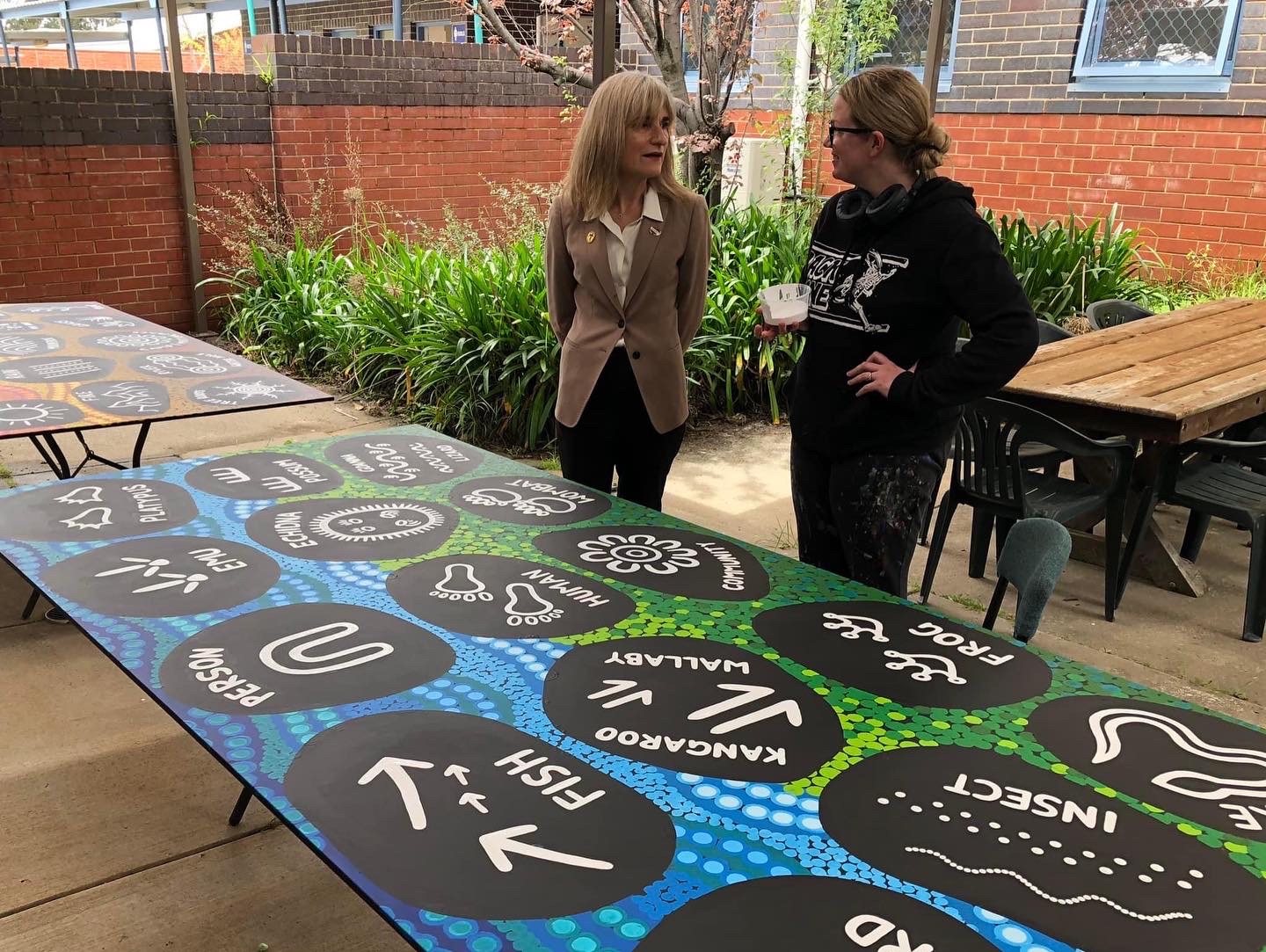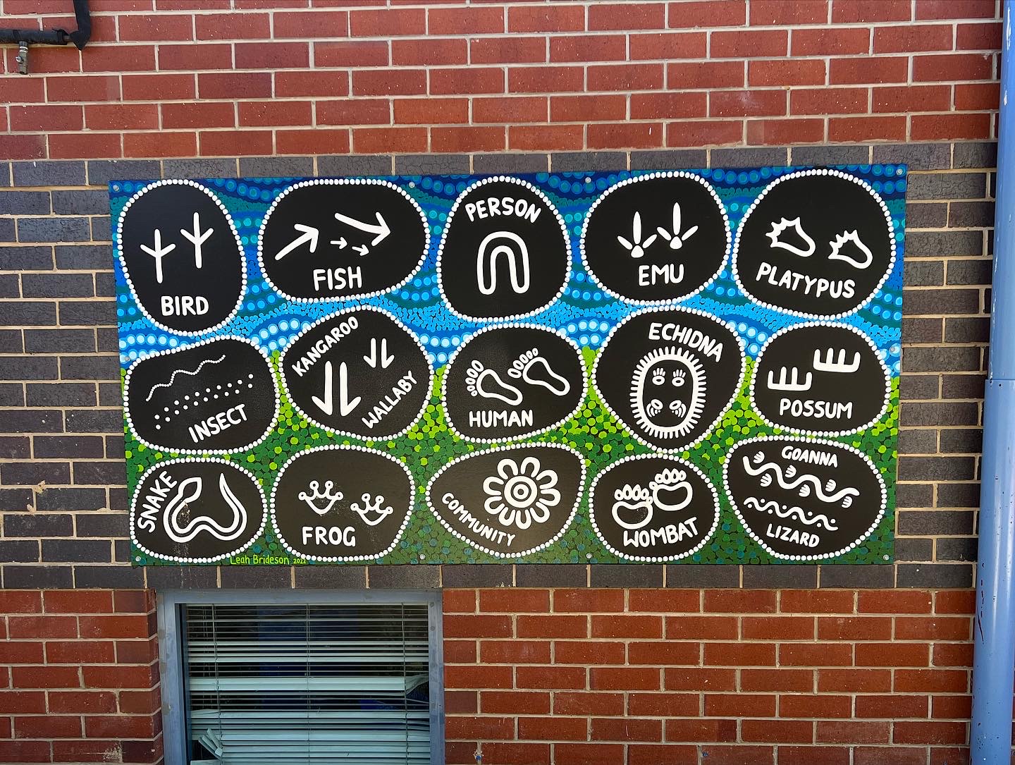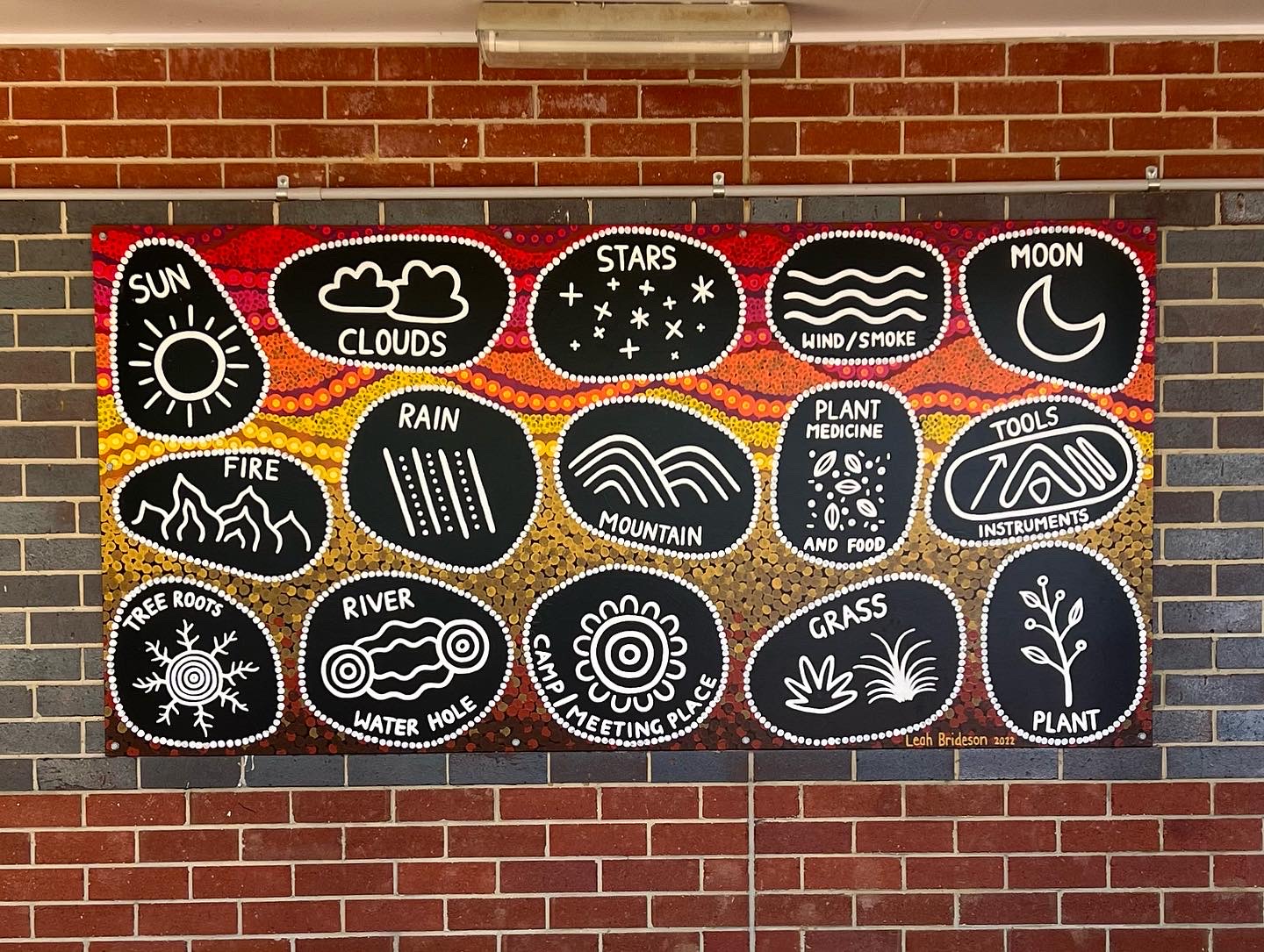 Below are two murals Leah created for Palmerston District Primary School for their sandpit areas featuring Aboriginal symbolism. Teachers can use the murals in teaching and learning and students can draw the symbols in the sand to experience traditional ways of storytelling.
