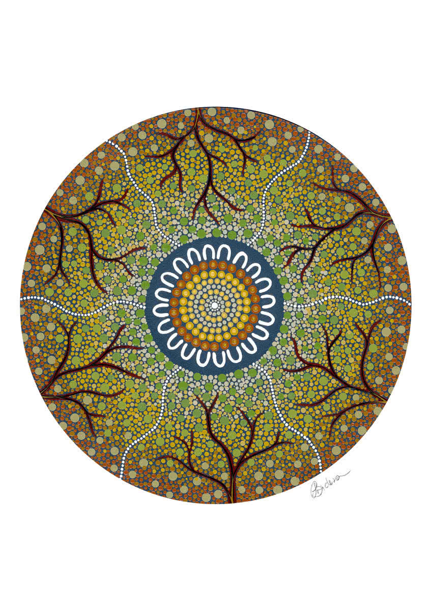 Autumn is one of my favourite seasons. Watching the colours of the leaves change and fall from the trees each year inspires so many ideas to paint the occasion. This piece celebrates the season of Autumn here on Ngunnawal country, showing the leaves dancing around the trees giving thanks to them as they float away, ready for new beginnings in coming months.
