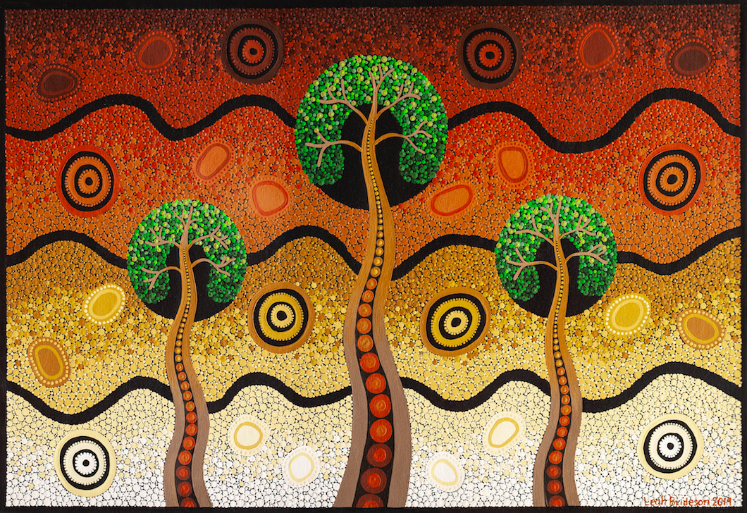Grow our kids up strong represents the passing on knowledge and sharing of culture to my children. Growing them up strong in their identity, as represented by the strength of the tree, and the importance of caring for country and the connection we have with country and the dreaming.