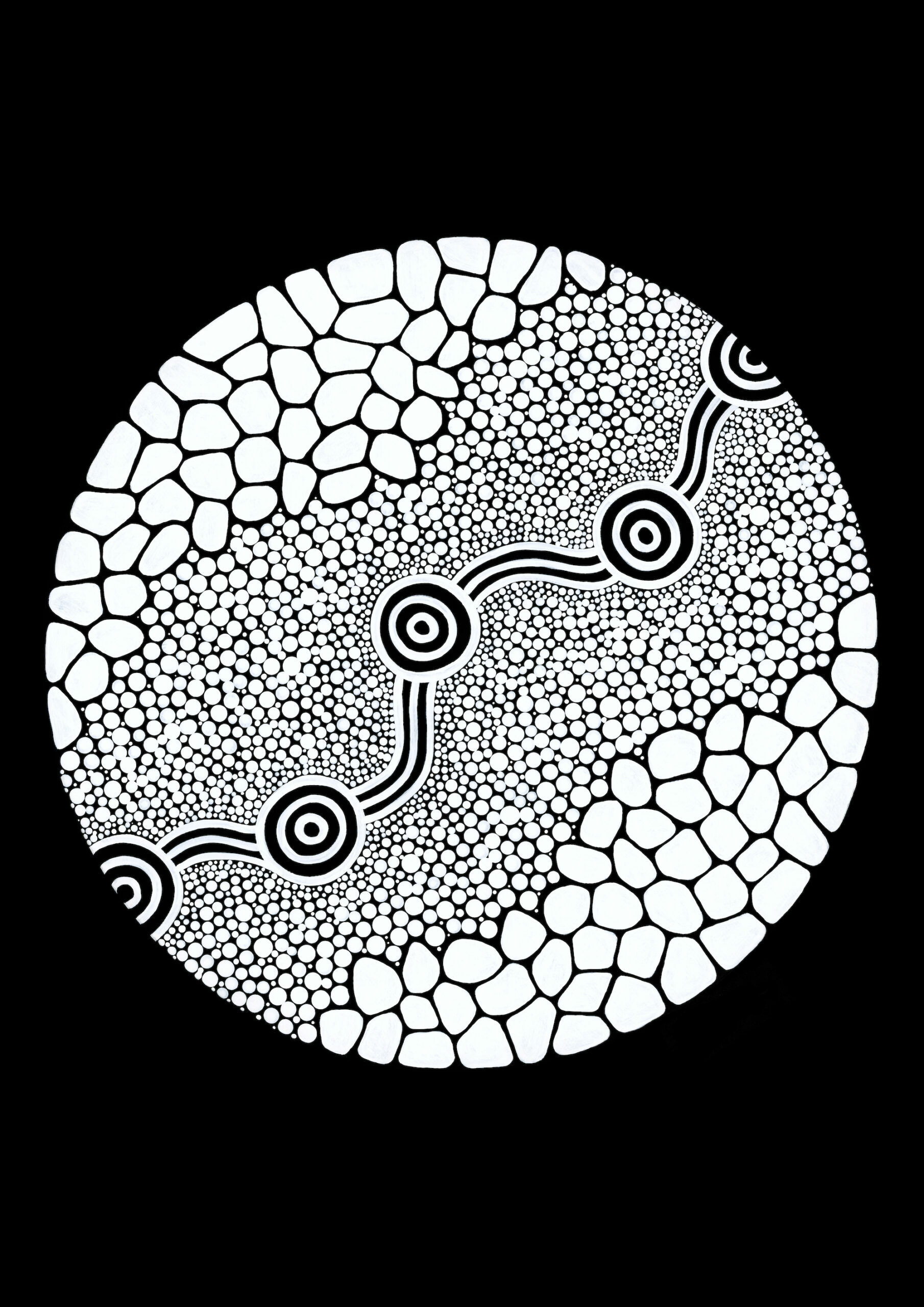 As a young child travelling back to country, I always sensed a great connection to these stretches of water, particularly from hearing stories of my dad and my grandmother playing down by the river with their siblings, cousins and friends. The dryness of my country is depicted in the cracked earth and the gradual vibrancy dots toward the river embodies the importance of caring for our waterways that sustain life.