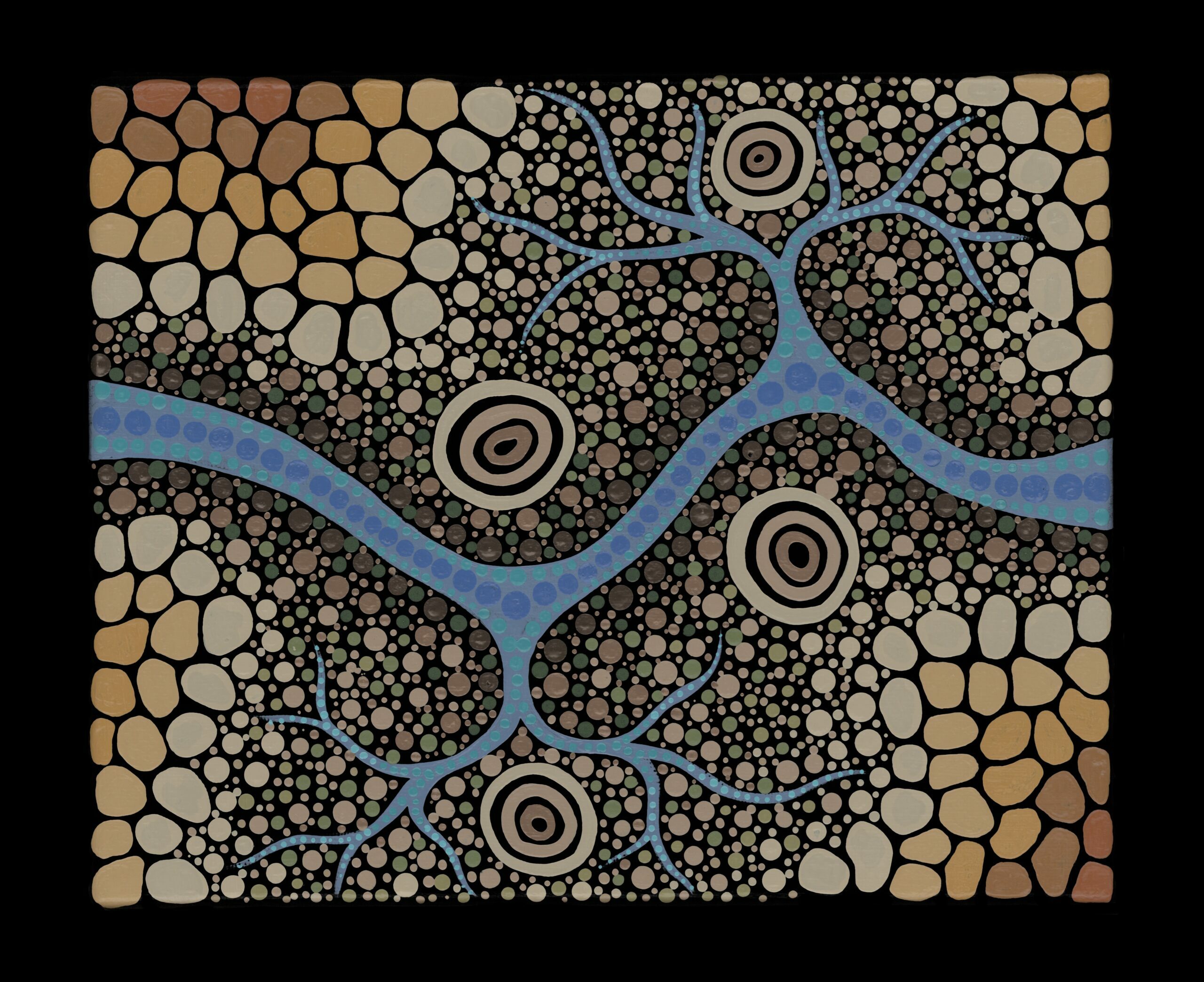 As a young child travelling back to country, I always sensed a great connection to these stretches of water, particularly from hearing stories of my dad and my grandmother playing down by the river with their siblings, cousins and friends. The dryness of my country is depicted in the cracked earth and the gradual vibrancy dots toward the river embodies the importance of caring for our waterways that sustain life.