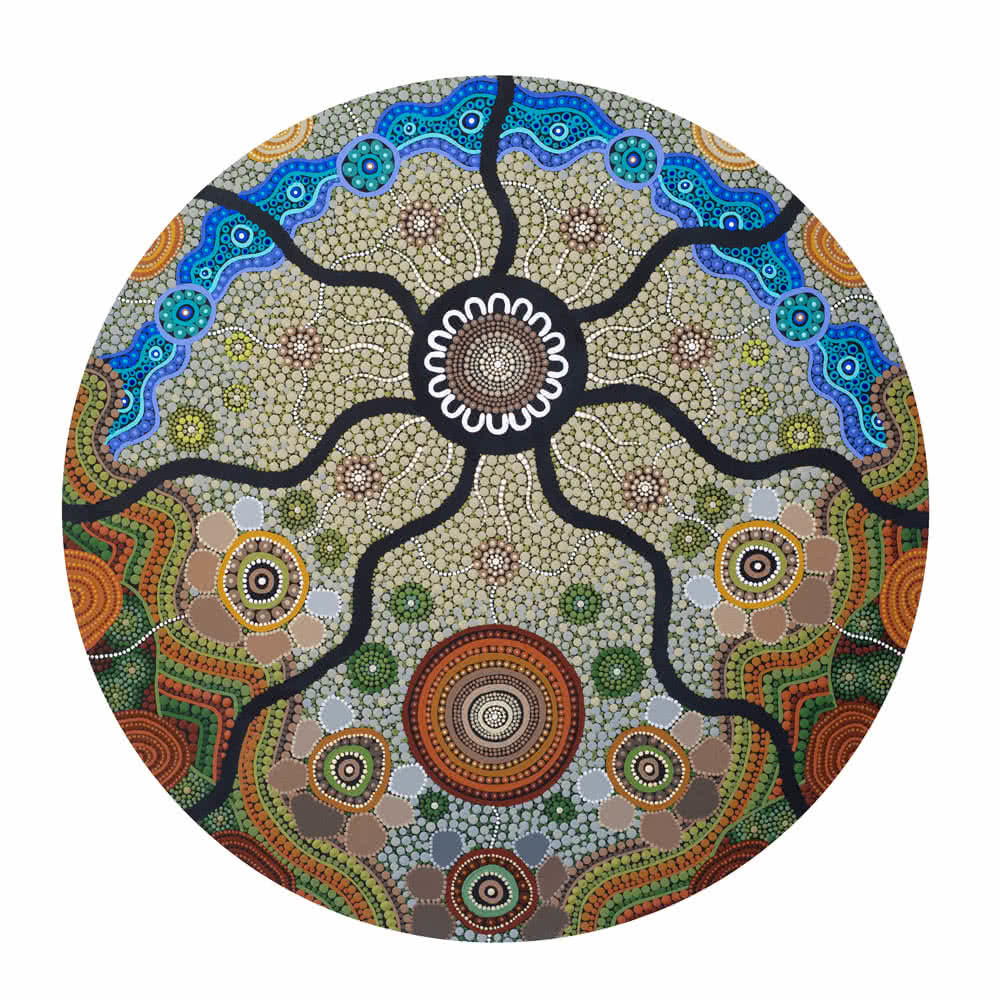 Though painted on a circular surface, the mountain lines on each side extend the scenery beyond the comfortable community bubble and lure the eye down into the depth of the culture and history in this space. There is so much more I want to know about my local, as represented through the multidirectional pathways. I am enticed by the finer details of the landscape and am discovering stories of people who walked here before me as represented through the multilayered dots.