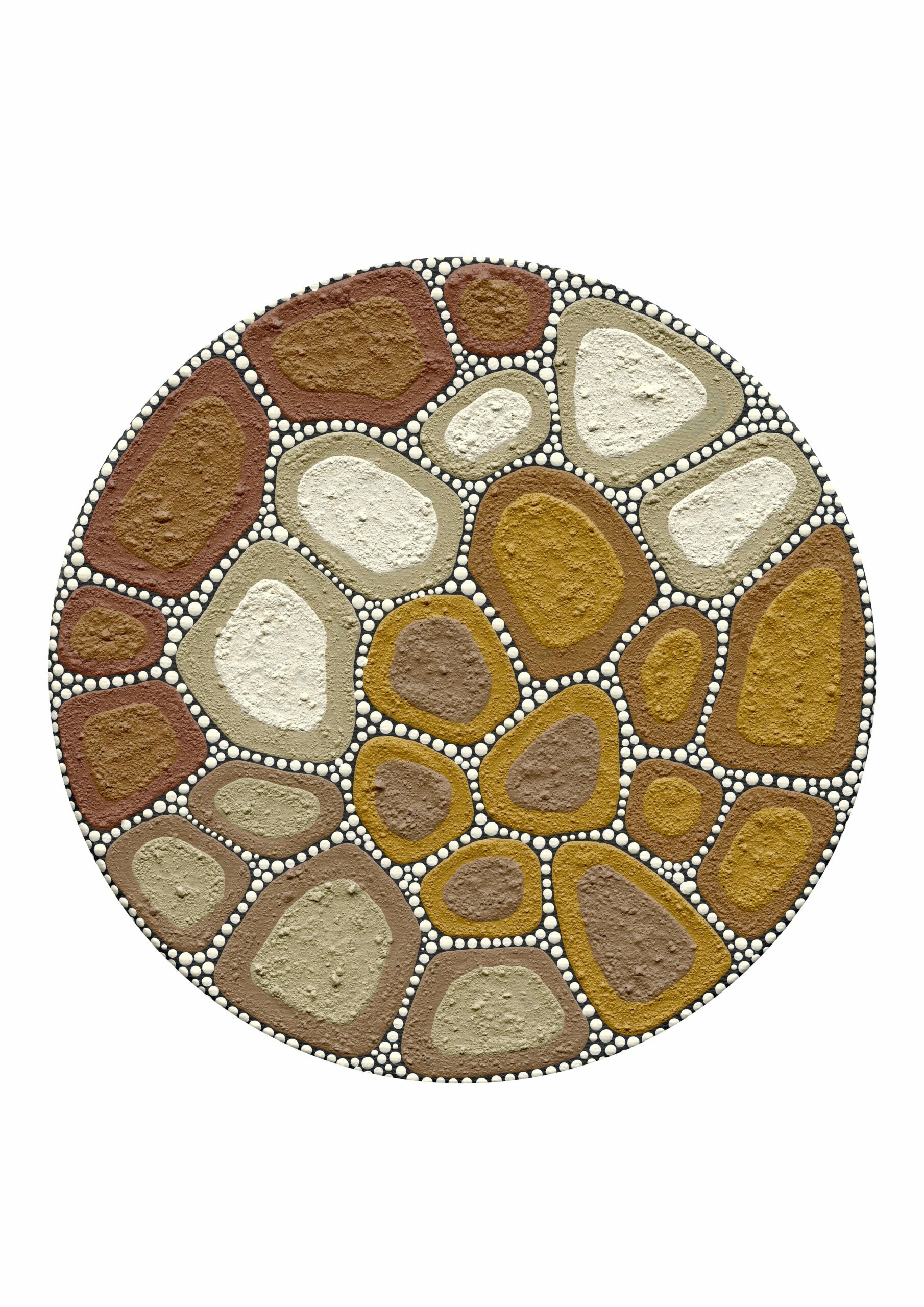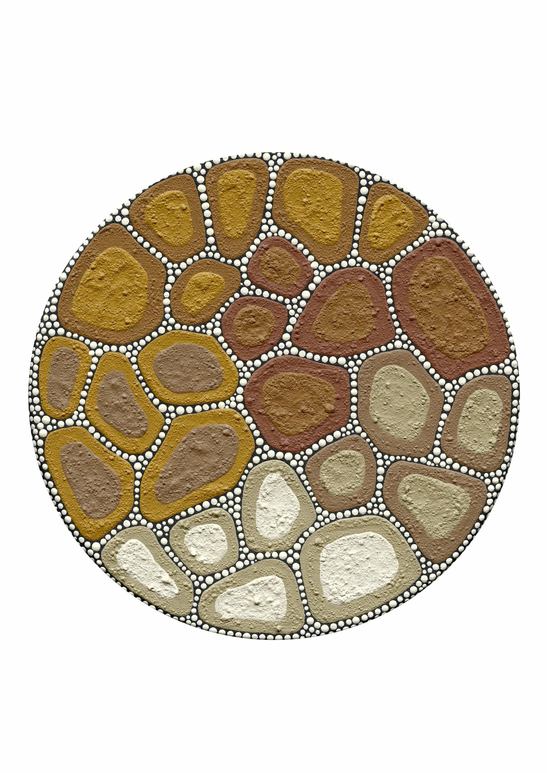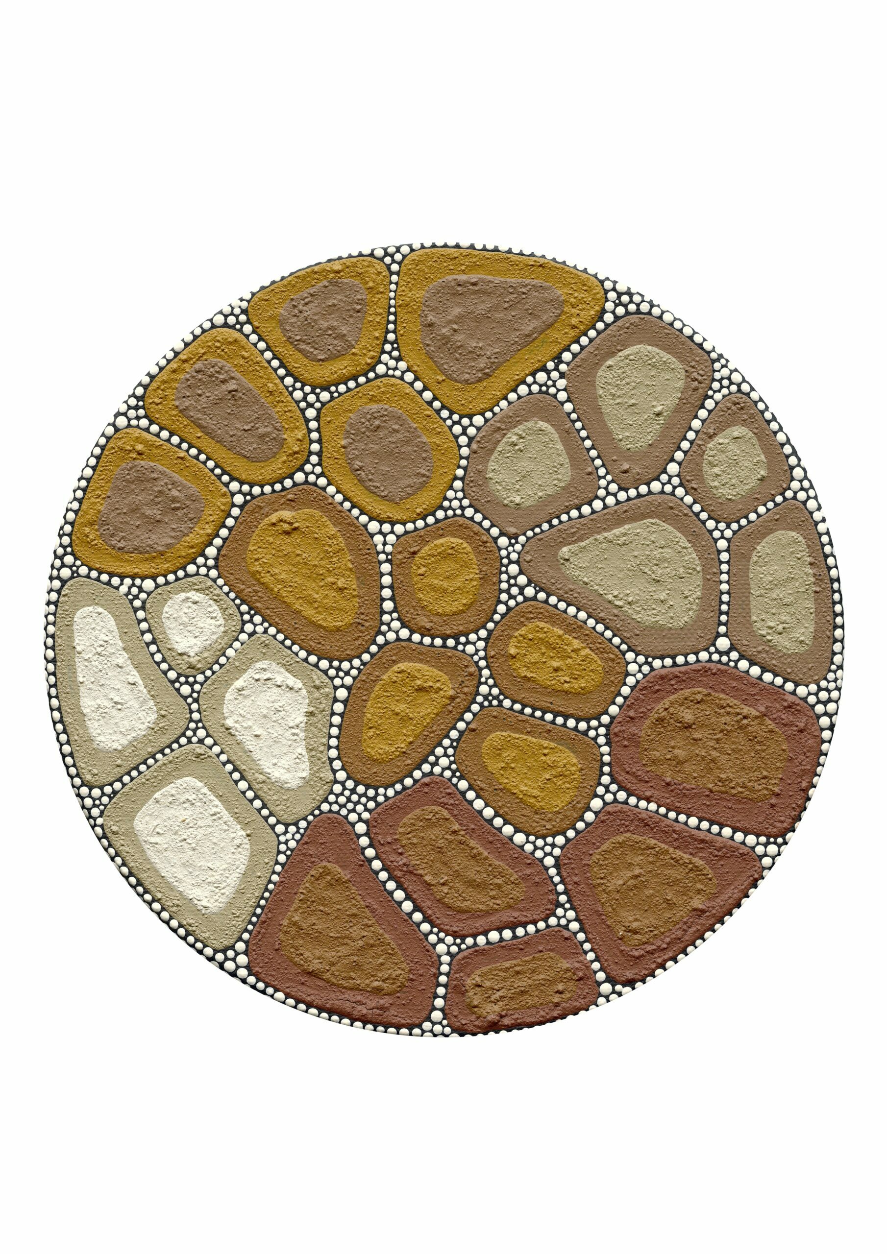 This triptych focuses on my signature style of ‘cracked earth’. I developed this style whilst observing my Country over the years, creating my first cracked earth piece in 2008. Kamilaroi country is often dry and cracked, but rich and deep in history, culture and story as represented by the space in between. The white dots between the cracks are a representation of continually walking through different pathways, finding more about who I am and the journeys of my Ancestors.