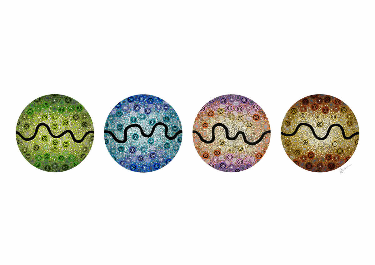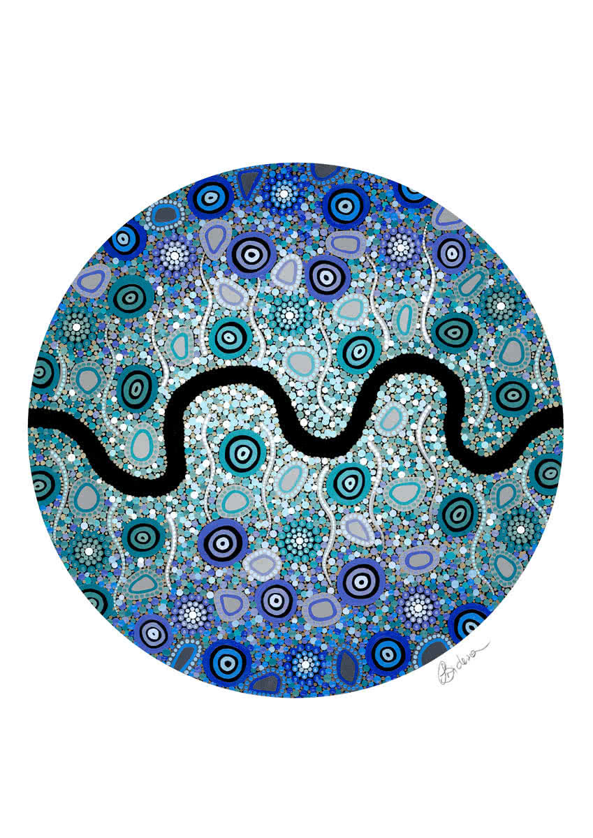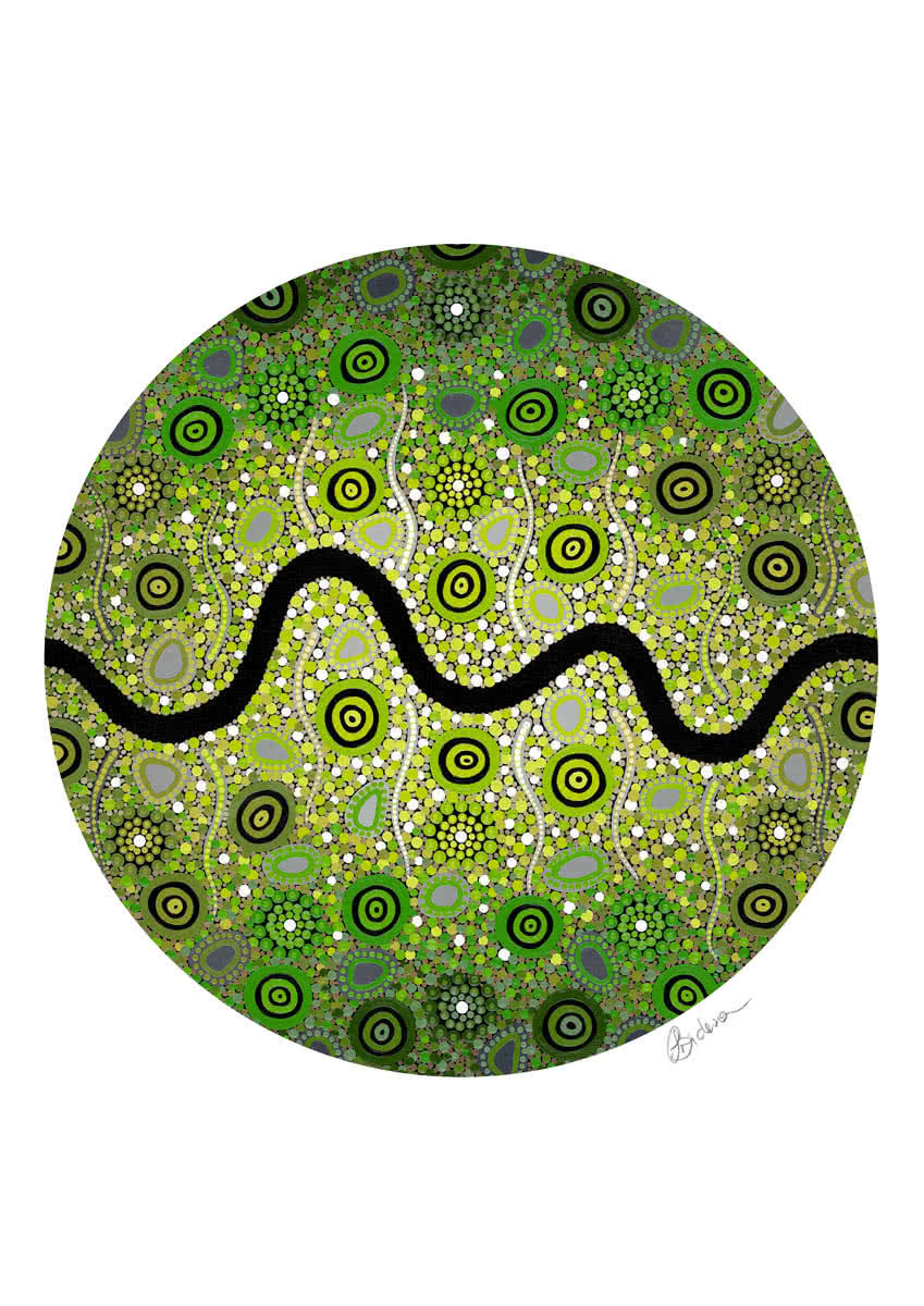 Pathways is reminiscent of my childhood journeys, looking for and following different pathways around my home, on bush walks and out on country. Following a new pathway each time, I am enticed by the finer details in the landscape. I pay attention to the smaller things and map out country as if I’m a bird flying over my path and converting real life objects in to Aboriginal symbolism. I find myself thinking a lot about the people who walked these pathways before me and acknowledge the traditional custodians in every step I take on my journeys.
