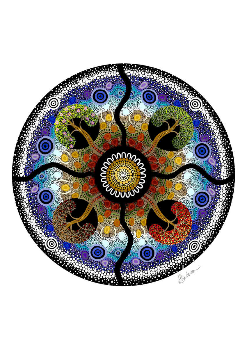 This piece works from the perspective as if I am looking down on myself, growing as a mum, as an Aboriginal woman and growing from the knowledge that has been passed down from my matriarchal figures. I am an extension of them and will carry their legacy with strength and pride. With myself at the centre, I continue to learn, grow and shine with the support around me and with the strength of country, sea and sky and my ancestors watching down on me.