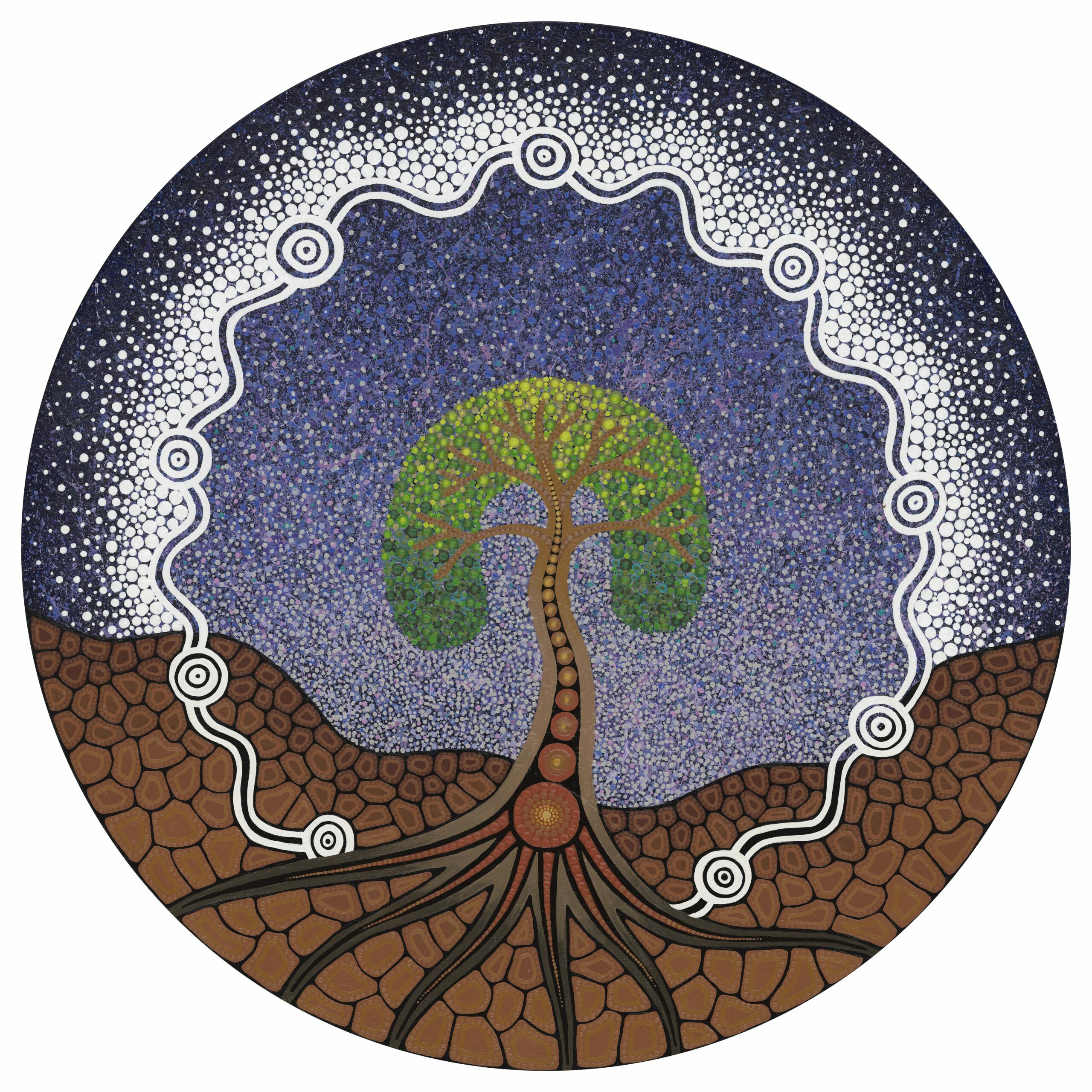 Strength is a story of the interconnection with the self, sky and Country. I am an extention of Country, with roots deep in the Earth, branches reaching to the sky and my Ancestors encircling through the Dreaming.