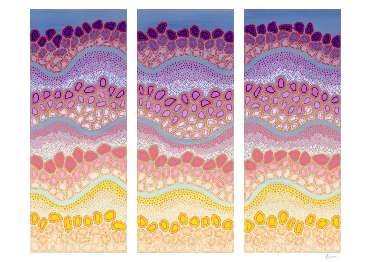 Sunset Illuminated has come to life from many evenings watching the sun set. Watching the vivid colours change within seconds before getting the camera out and trying to photograph the colours in my mind for reference. There’s nothing like what the eye views and I sent hours mixing colours to showcase a range of sunset stages. Each time the sun sets I take a minute to reflect on my day and think about my ancestors and how grateful I am to be able to share our stories through the platform of art.