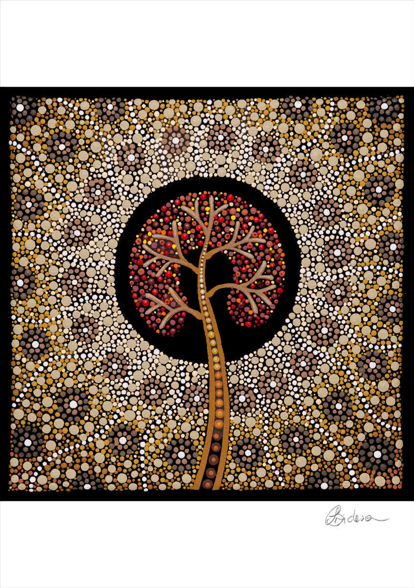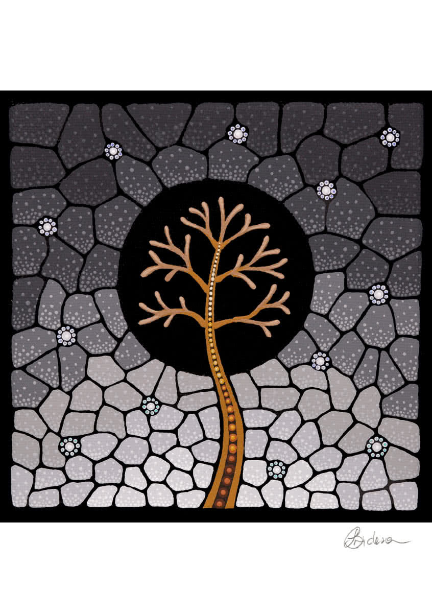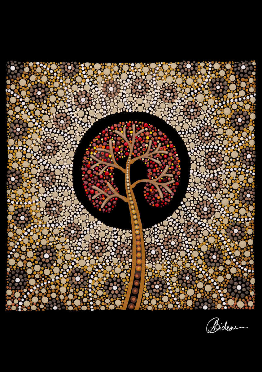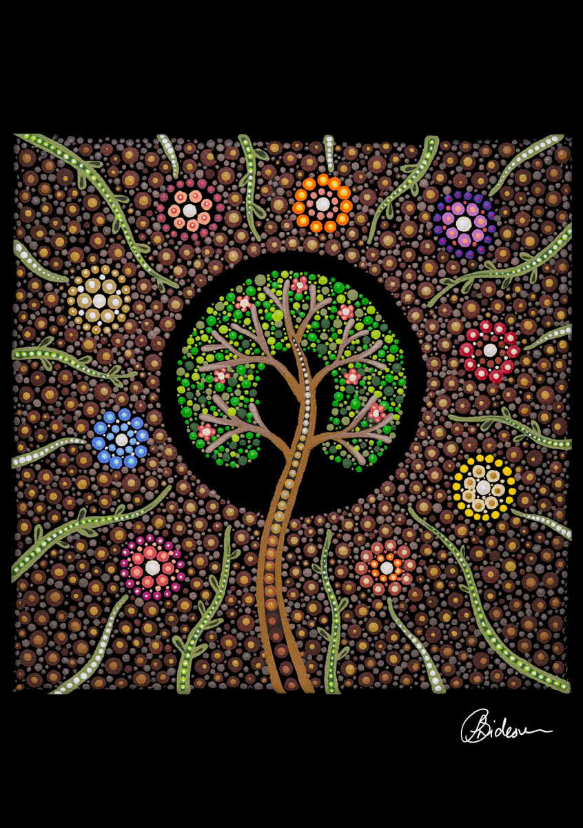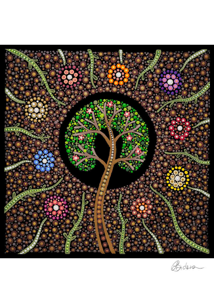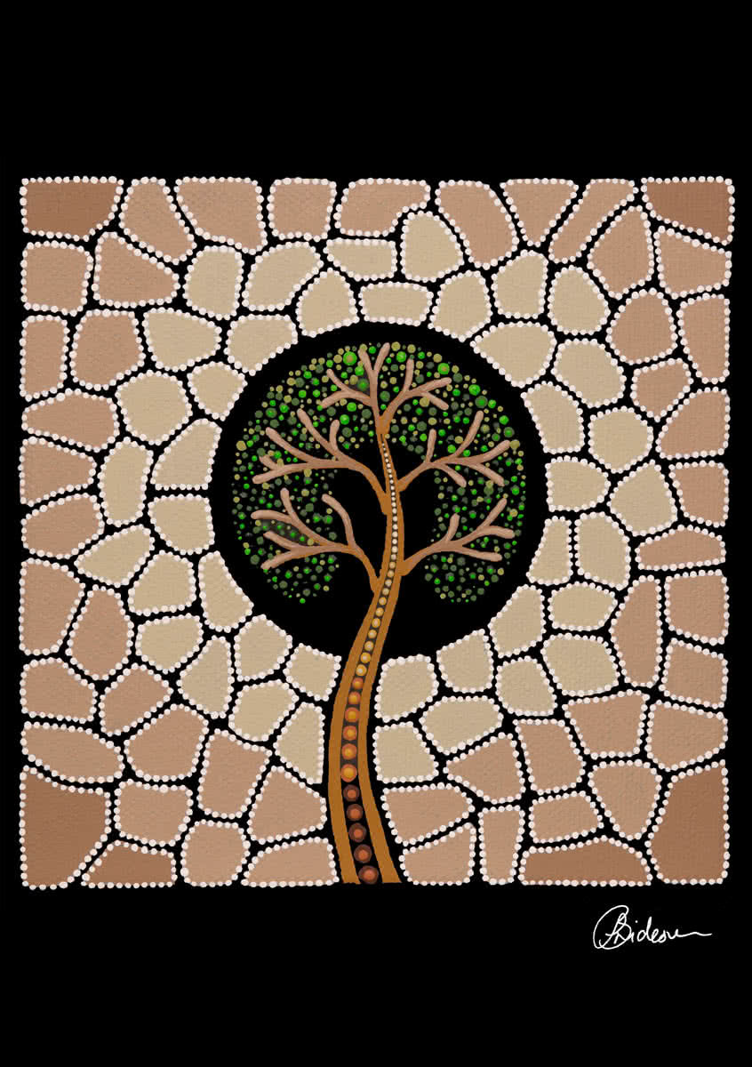 The tree of life symbolises the strength of our people and their endeavours in protecting, building and sustaining our people and our rich culture. The arms of the tree symbolise our mob reaching out to inspire present and future generations, passing on knowledge, strength, and providing guidance for continual growth, with roots embedded in culture and country.