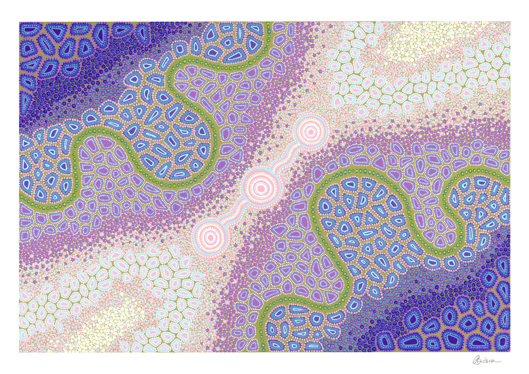 Water Illuminated is a representation of the flow of water on country. The sun rays enlighten the ripples of the water and the underlying texture of country as the water flows through. I appreciate looking at the little details and finding different ways to paint movement and flow with colour intertwined, particularly water and its ever changing colours as it reflects and dances with light.