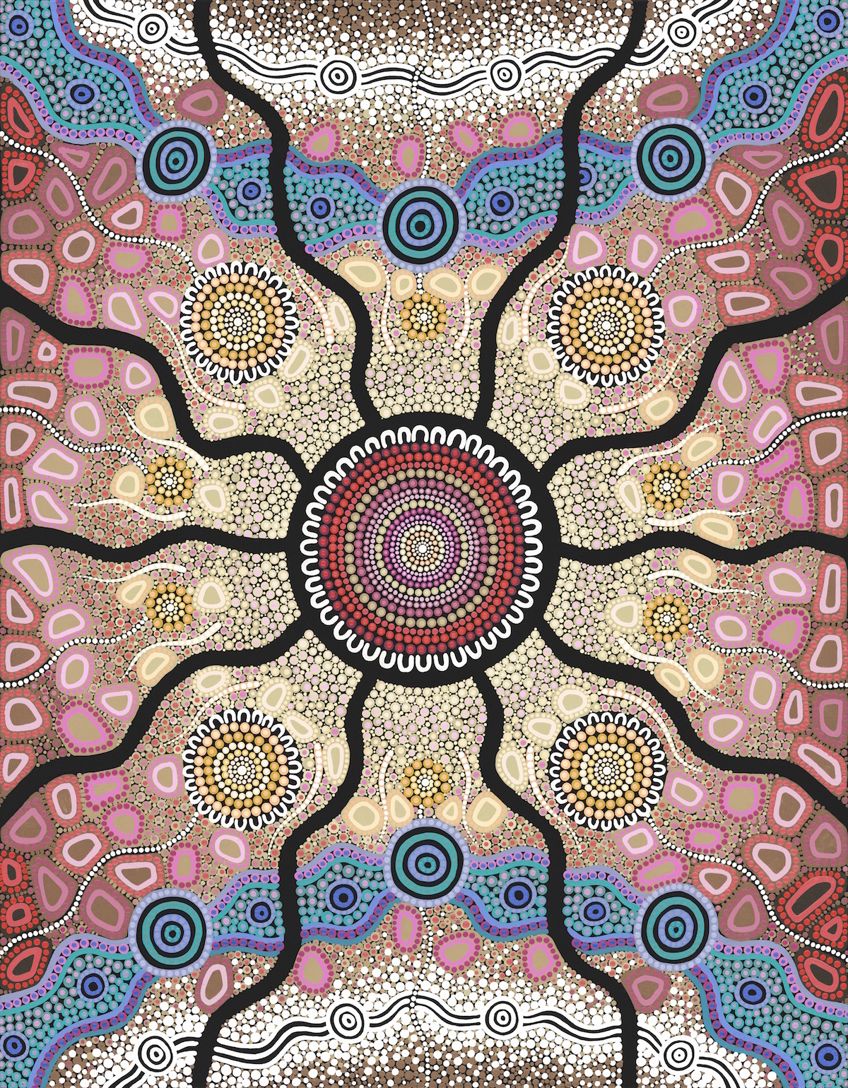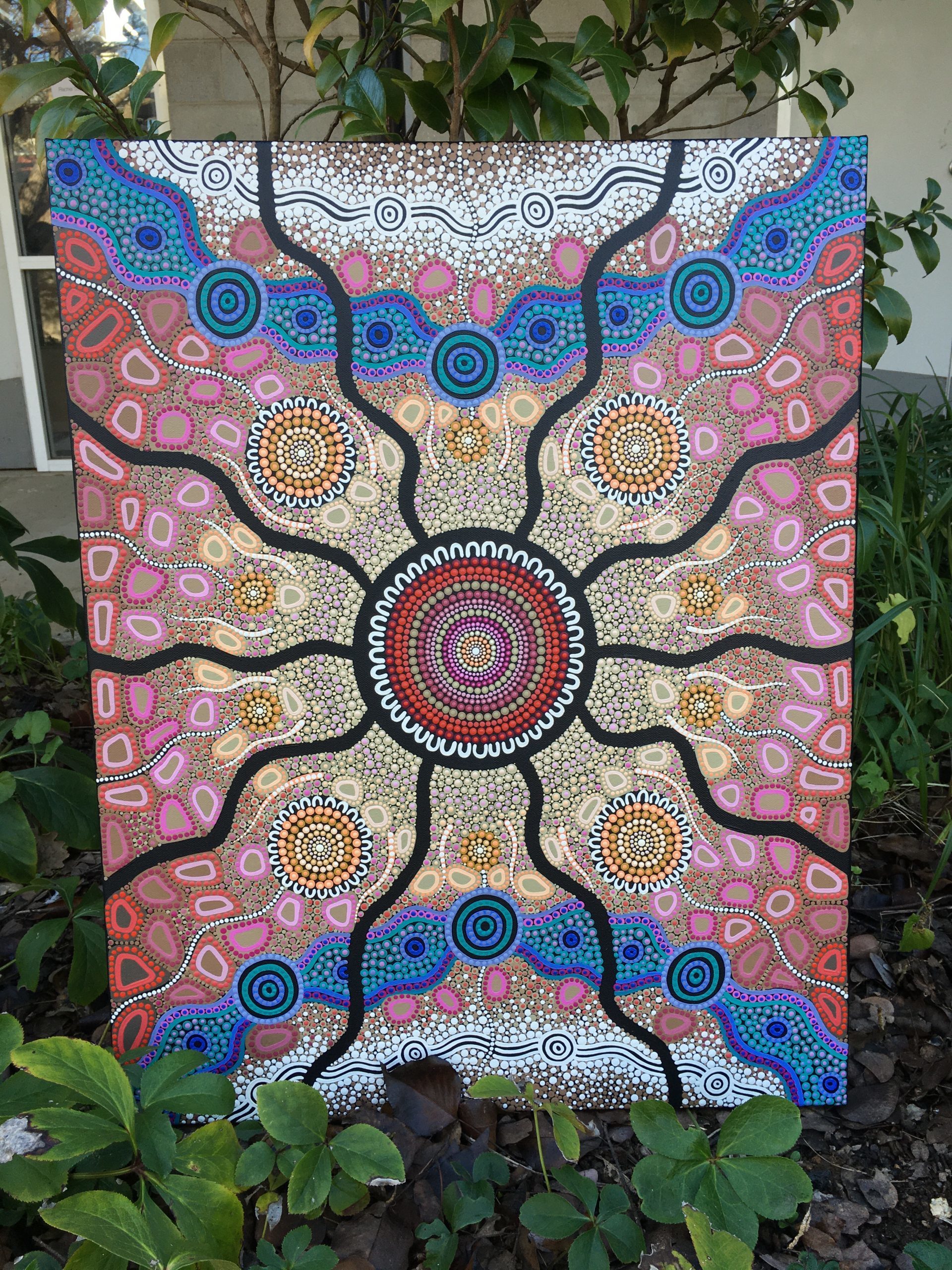 Yaliwunga Nguwa represents the 2020 NAIDOC theme, “Always Was, Always Will Be” through our ongoing connection to this country, our Mother Earth. We have been here for 65,000+ years. We have survived through environmental change, through colonisation and the continual impacts of both because we hold the knowledge of how to care for country, with her in turn caring for us. Country is central to our being, our reason and our life source. We have a fundamental role in ensuring her voice is heard, her needs are met and to ensure she stays healthy for our children’s futures by treading lightly and fighting for her. The pathways symbolise sharing her voice across the land, whilst the meeting place depicts coming together, listening, learning, taking action and acknowledging the knowledge, cultures, and longstanding custodianship and connection to the country of First Nations People.